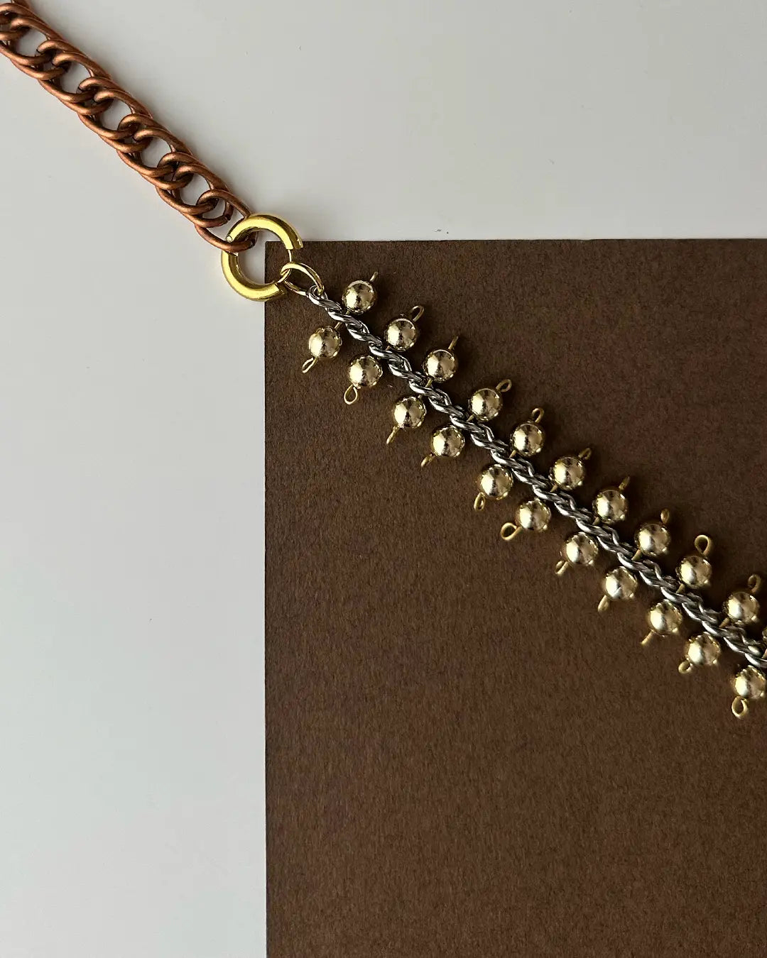 Description : Collier mixte - chaîne acier, bronze & perles dorées.